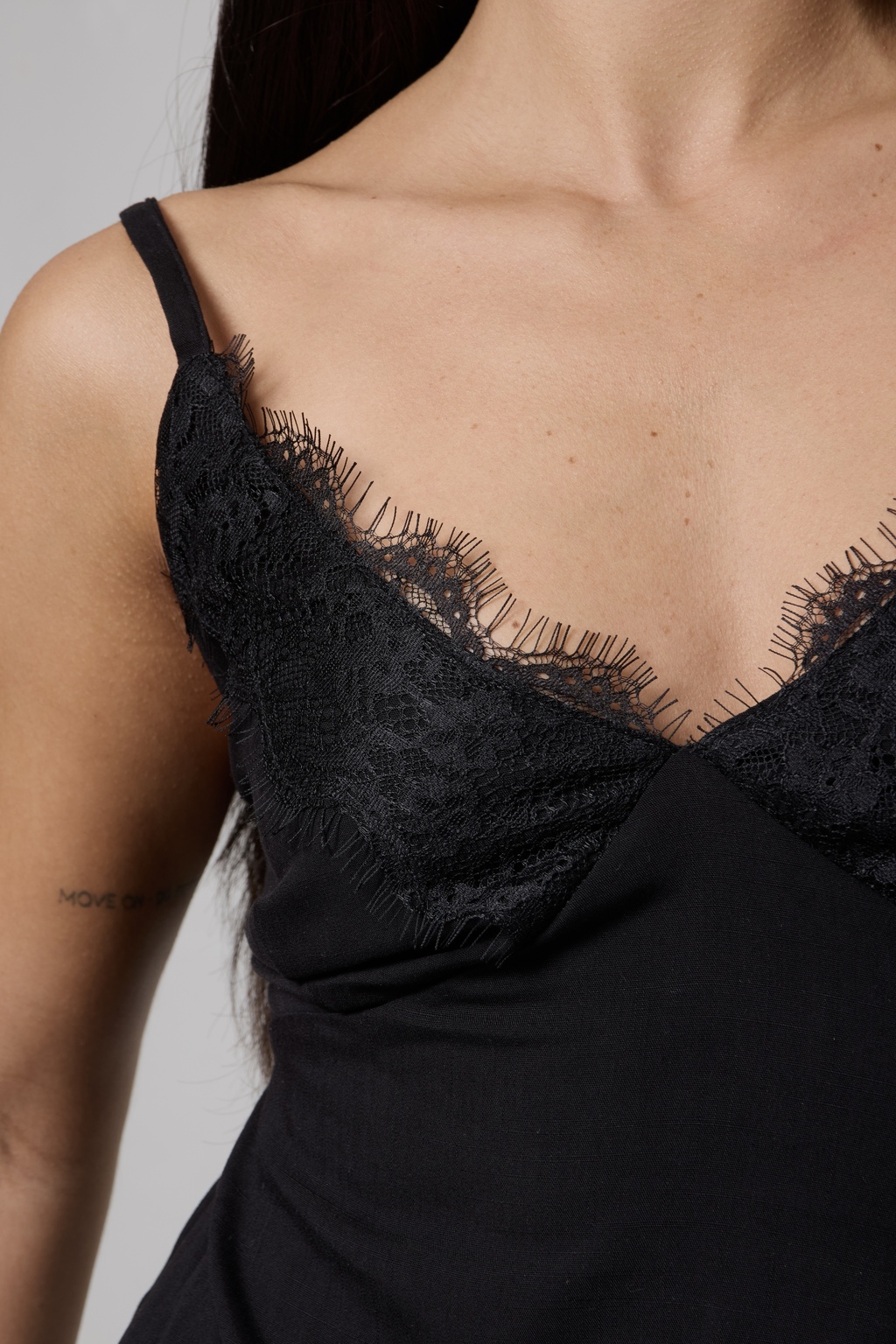Blusa feita em viscose com aplicação de renda no decote, possui lástex nas costas e regulador nas alças.